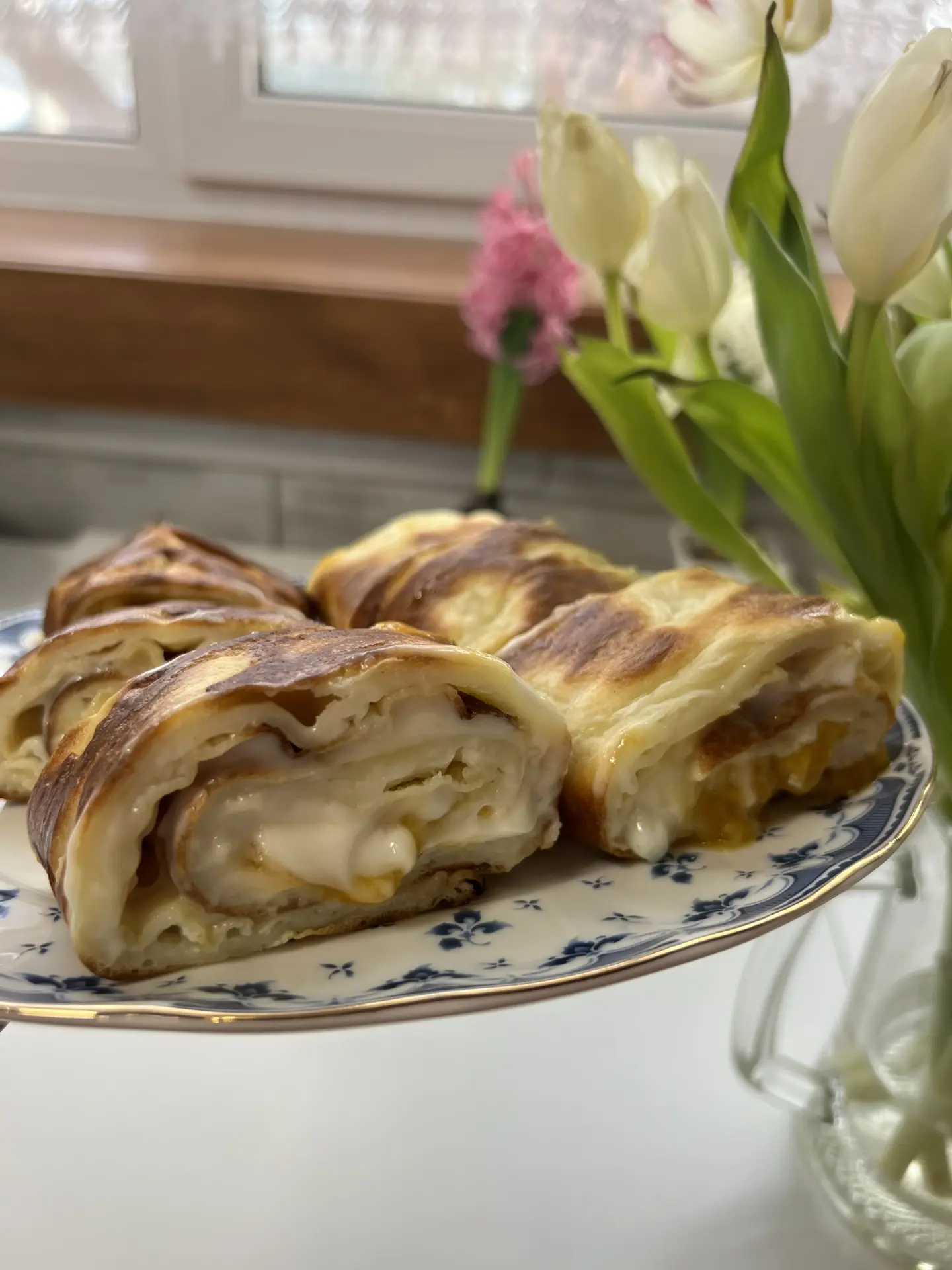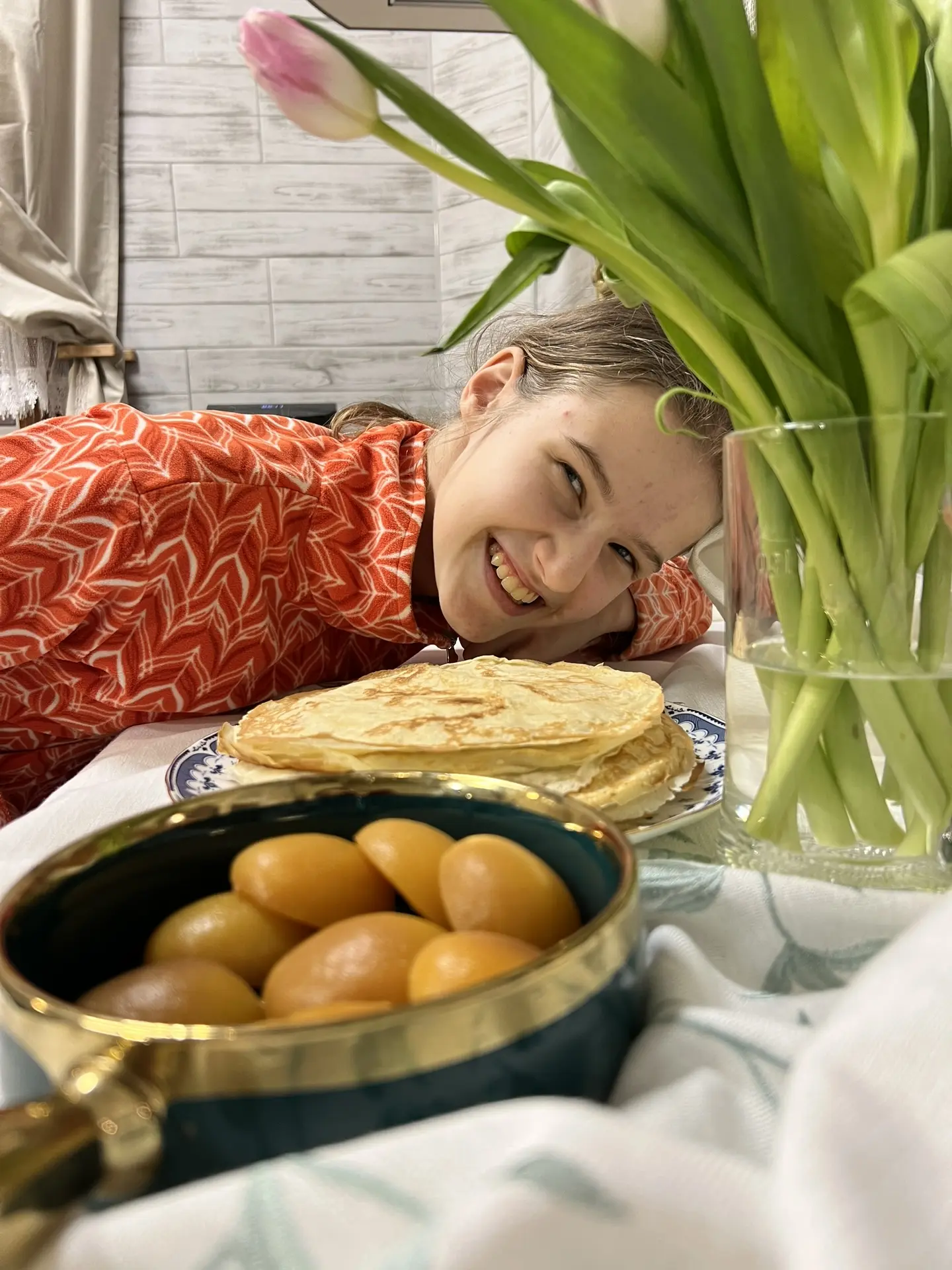 Тесто обычное для блинов, но пекли мы его в духовом шкафу! Есть в этом процессе что-то древнее и уютное: пока огонь (газ или электричество) творит свое дело за закрытой дверцей, тесто превратилось в ровное, воздушное, золотистое ‘полотно’. Никакой суеты, только предвкушение.