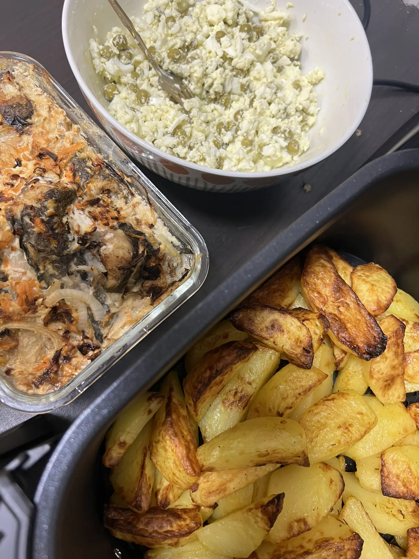 Салат еще сообразила - отварное яйцо + горошек + майонез . Яиц много уже не знаю что готовить с них 🤪куры как из пулемета несут