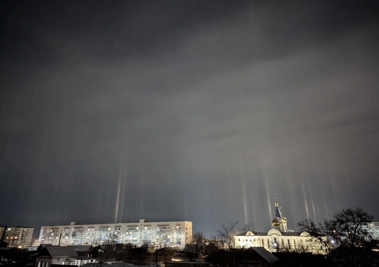 С наступлением морозной погоды и снега в Астраханской области наблюдаются световые столбы. Красивое оптическое явление запечатлел астроном-любитель Тимофей Курьянов в Ахтубинске.