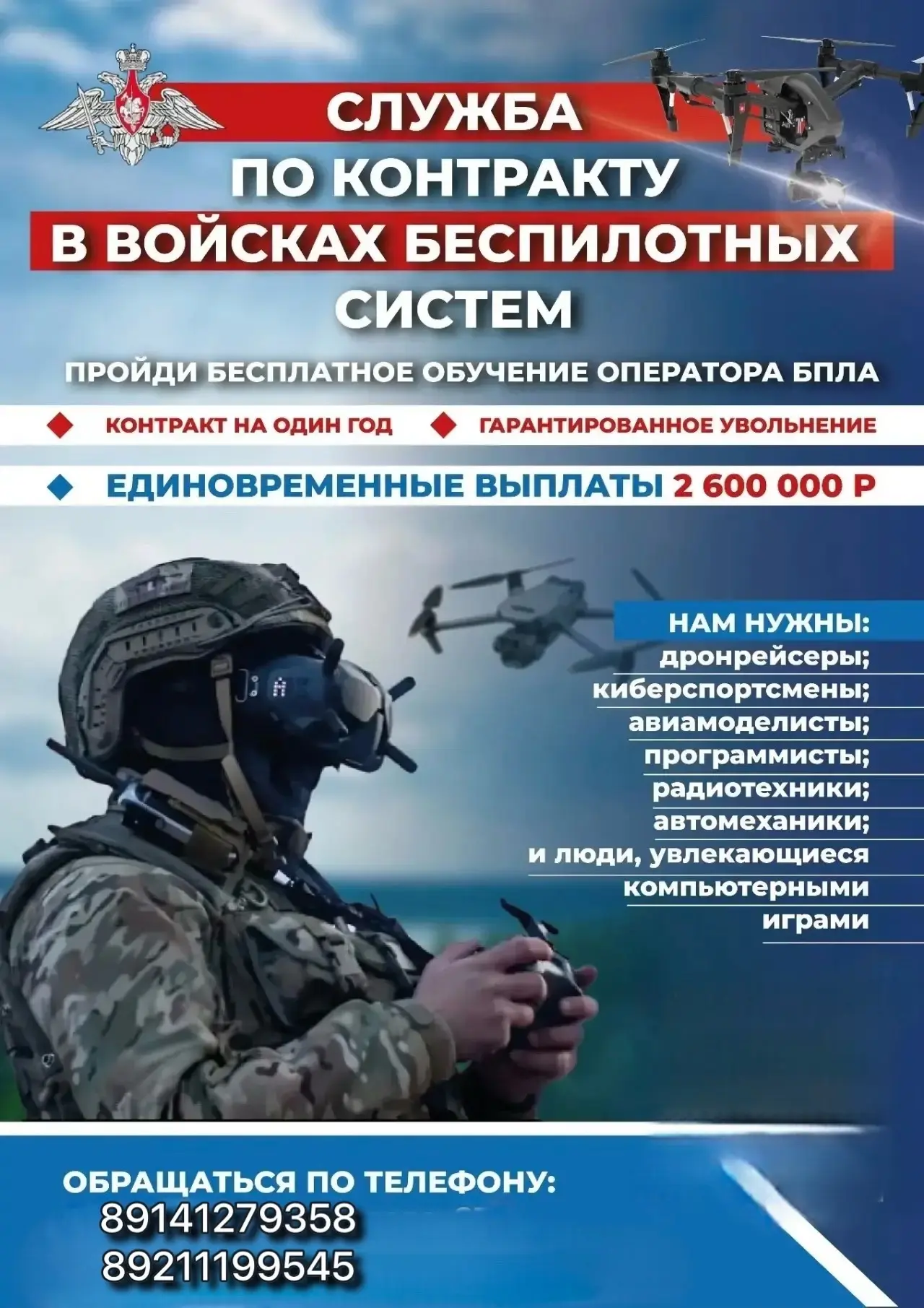 ‼️ТРЕБУЮТСЯ ДОБРОВОЛЬЦЫ НА ОБУЧЕНИЕ ОПЕРАТОРОВ БПЛА, ЕДИНОВРЕМЕННАЯ ВЫПЛАТА 2млн. 600тыс. ‼️КОНТРАКТ РОВНО НА ОДИН ГОД ‼️ номер для связи: 89141279358