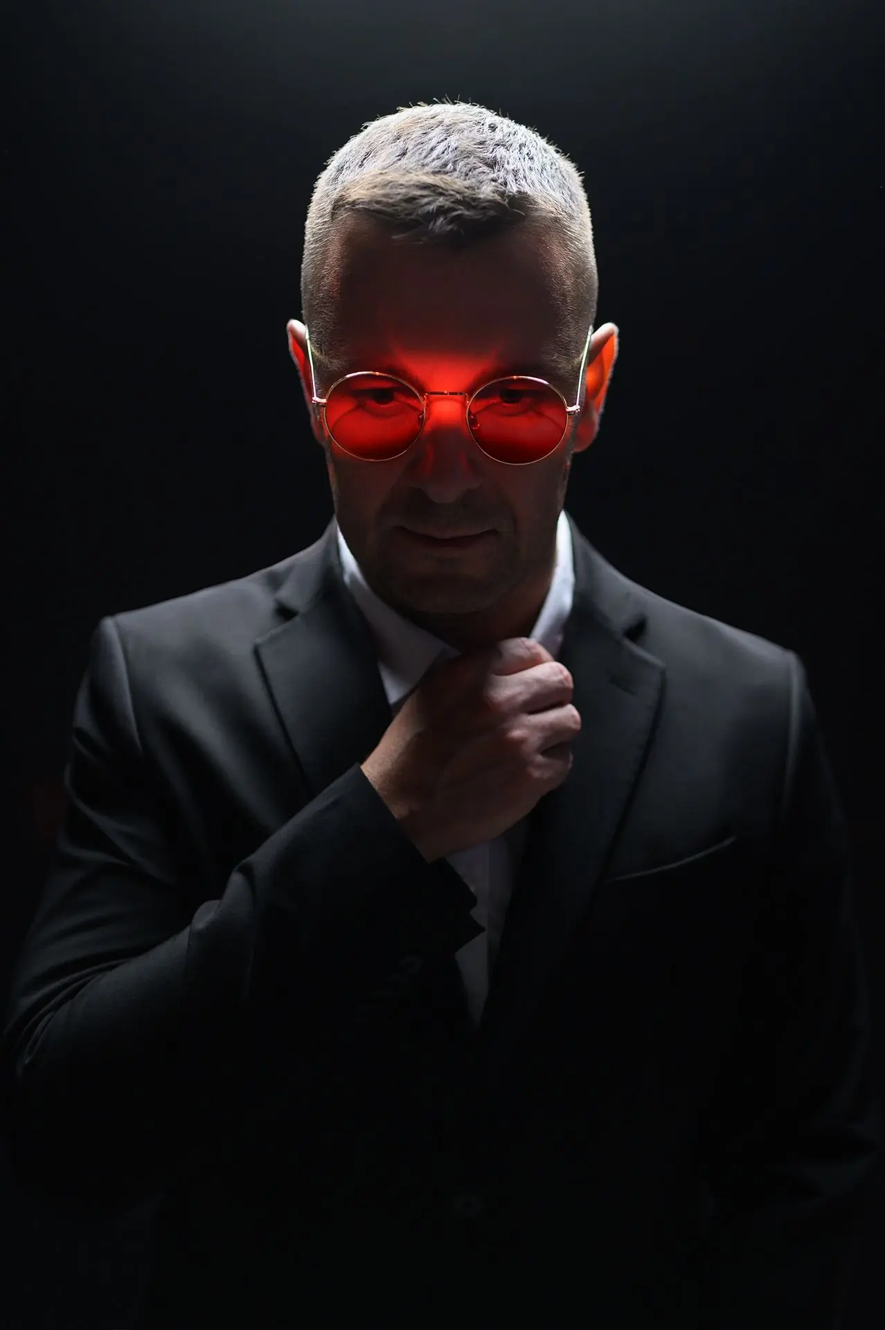 3. Этот мужской портрет был создан с использованием знакомой техники, но выполнен в темных тонах. Я применил оптическую насадку, чтобы получить узкую полосу света. Такой эффект можно достичь с помощью специальных шторок, регулирующих ширину светового потока. Над головой модели я разместил второй источник постоянного света с софтбоксом, создающим мягкое освещение. Свет становился градиентным, что придавало фигуре ощущение растворения в темноте. Благодаря этой технике акцент был сделан на глазах, точнее, на красных очках, а верхний свет делал лицо и одежду героя легко читаемыми. Простая схема с двумя источниками постоянного света дала эффектный результат.