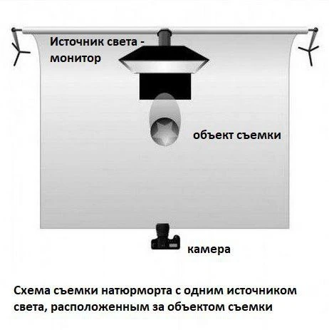 Световая схема – с одним источником света, расположенным сзади объекта съемки. В качестве источника света используется монитор. Объекты съемки располагаем между камерой и источником света. Дополнительные источники света и отражатели не использовались.