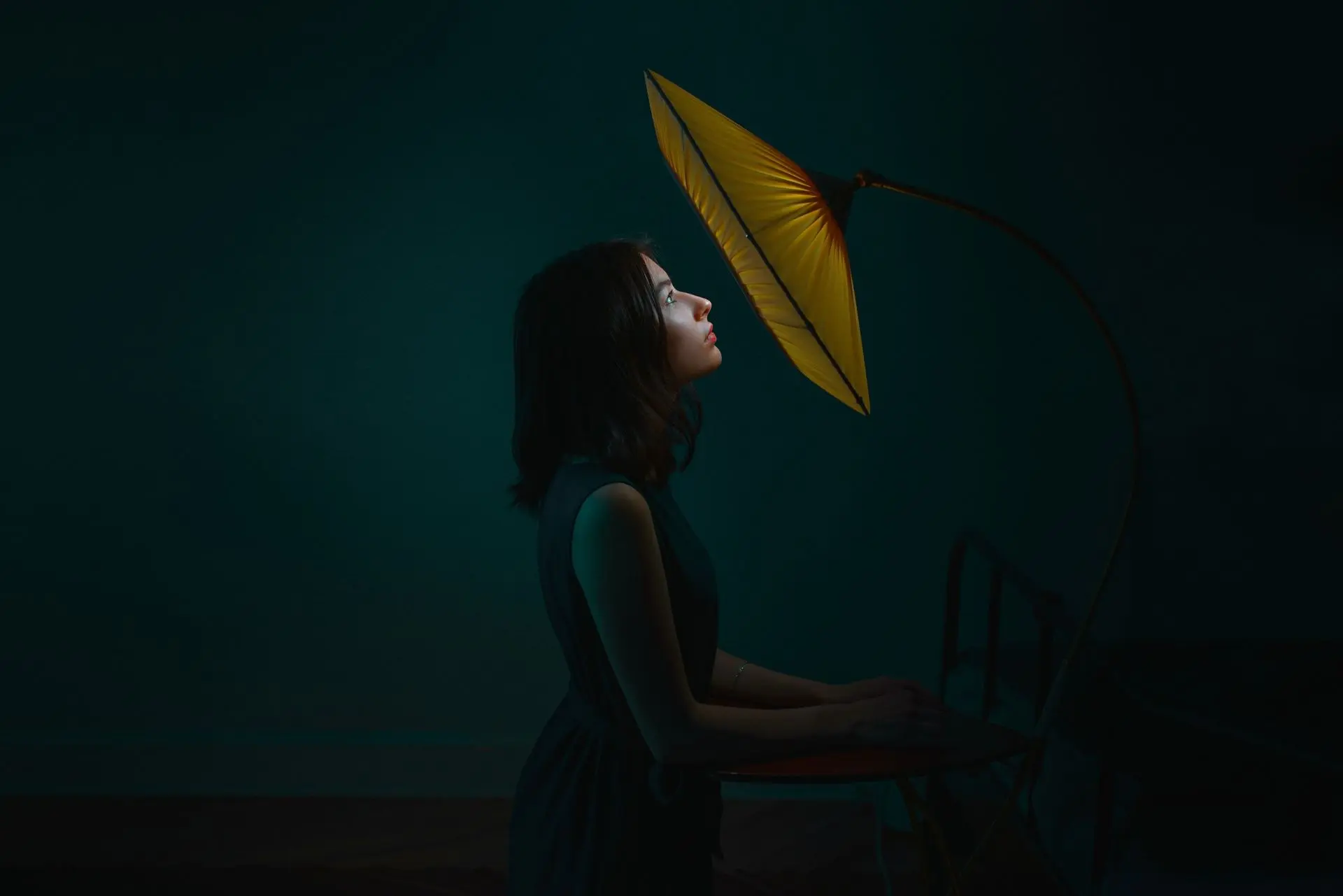 Для этого кадра я разместил источник постоянного света с оптической насадкой над головой модели. Важно было точно рассчитать область светового пятна, чтобы оно освещало только модель, не рассеиваясь по полу. После съемки я намеренно снизил цветовую температуру фотографии в редакторе. В рамках серии мне было важно подчеркнуть переход от одиночества и отчужденности героини к более живому состоянию.
