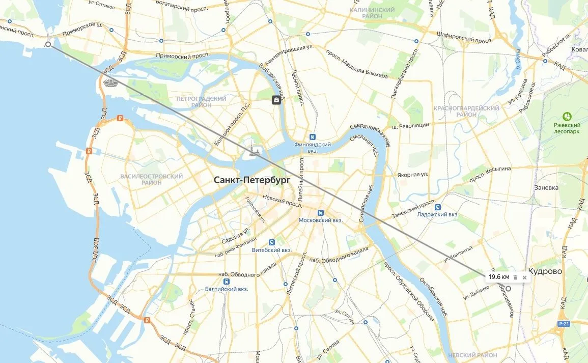В подавляющем большинстве случаев доминанты должны находиться на расстоянии от 2 до 20 км. от точки съемки. Если расположить точку съемки ближе, то доминанта не поместится полностью в кадр, если дальше, то доминанта получится размытой из-за атмосферы. Алгоритм выбора точки съемки, следующий: сначала решаем, какие доминанты хотим видеть в кадре. Для примера рассмотрим город Санкт-Петербург. Допустим, я хочу разместить в одном кадре небоскреб Лахта-центр, стадион Зенит-арена и Петропавловскую крепость, чтобы доминанты оказались на одном кадре они должны быть расположены на одной прямой, для этого открываем любую карту и соединяем доминанты прямой; прямую продолжаем в район, где предположительно находится точка съемки, здесь я обычно пользуюсь Яндекс. Картами и линейкой.