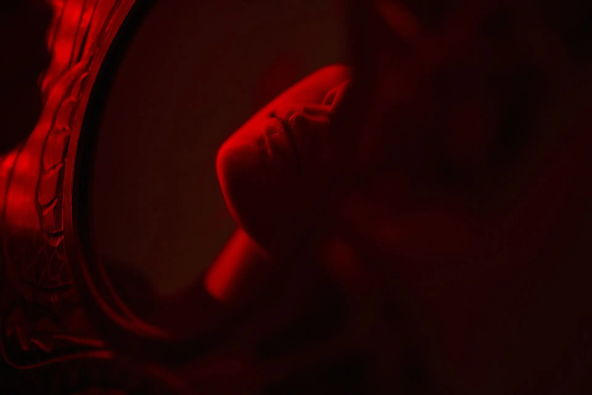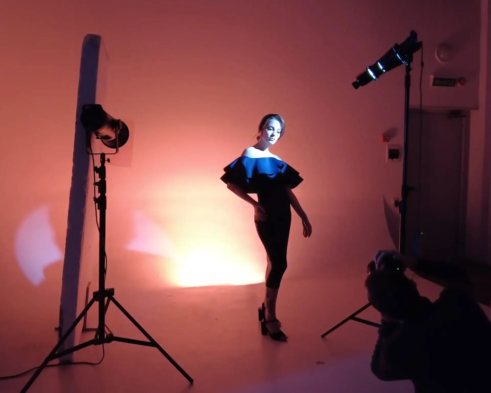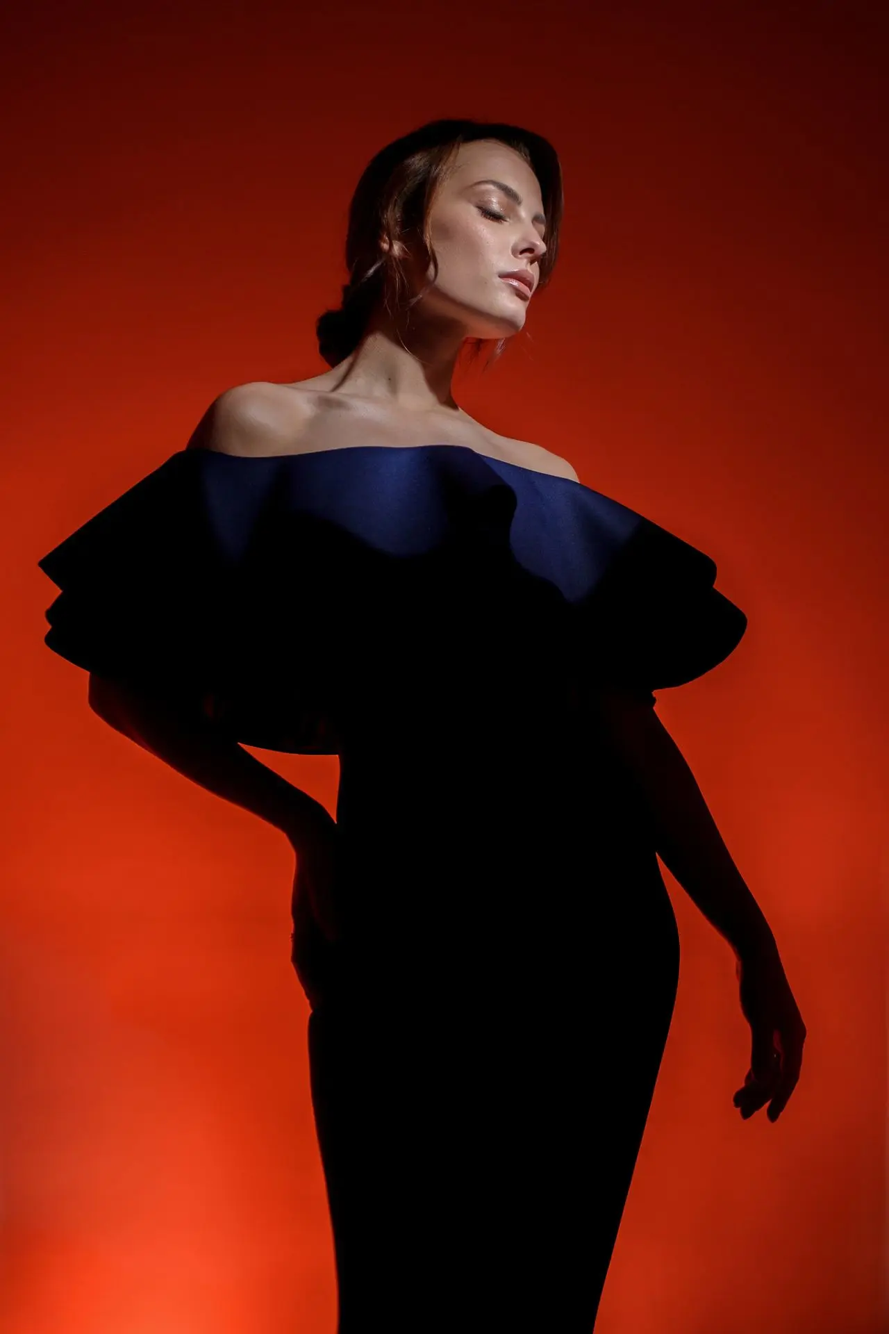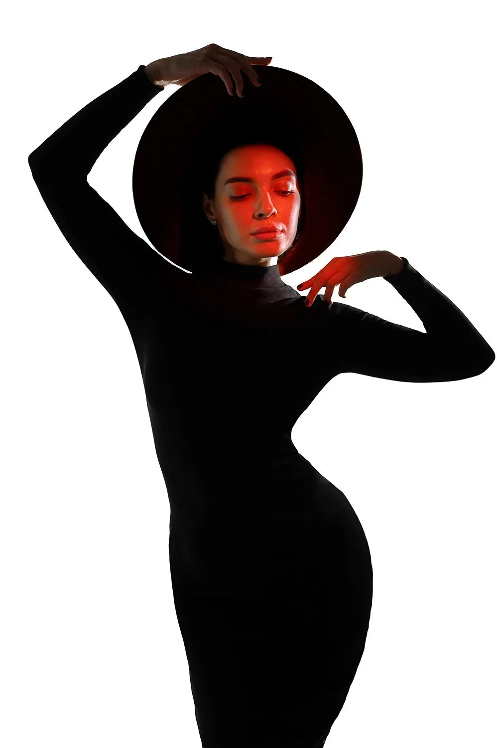 2. Для создания этого снимка один прибор был направлен на циклораму позади, подсвечивая ее красным светом, а оптическую насадку я настроил так, чтобы она освещала нейтральным белым светом лицо модели, немного подсвечивая и платье, которое было комплементарным по оттенкам фону.