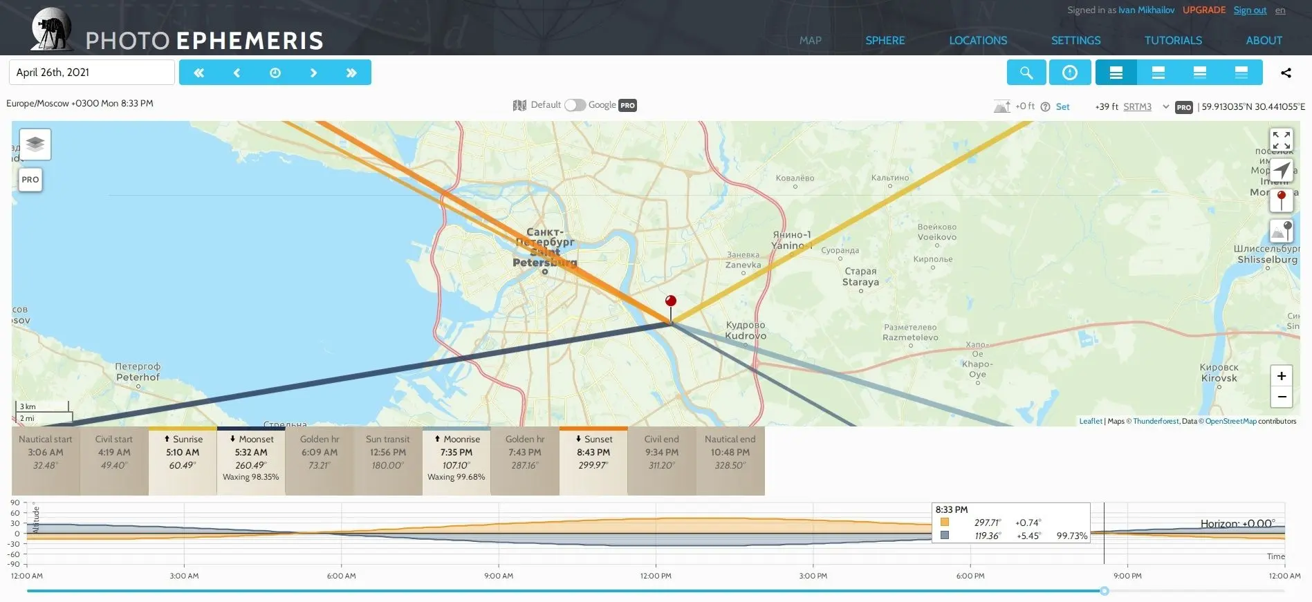 это результат расчётов, остается вопрос, как именно это рассчитать? Ближе к концу статьи я расскажу про одно замечательное приложение на телефон, которое значительно упрощает процесс расчета времени съемки и поиска точки съемки. А пока поведаю о том, как можно сделать все то же самое, не покупая данное приложение. Итак, есть один полезный сайт для фотографов app.photoephemeris.com. На этом сайте есть бесплатная версия карты, на которой отображается направление восхода/заката луны и солнца, относительно точки съемки. Устанавливаем флажок в найденную нами точку съемки и начинаем изменять дату, пока направление заката солнца не совпадет с прямой, на которой расположены доминанты.