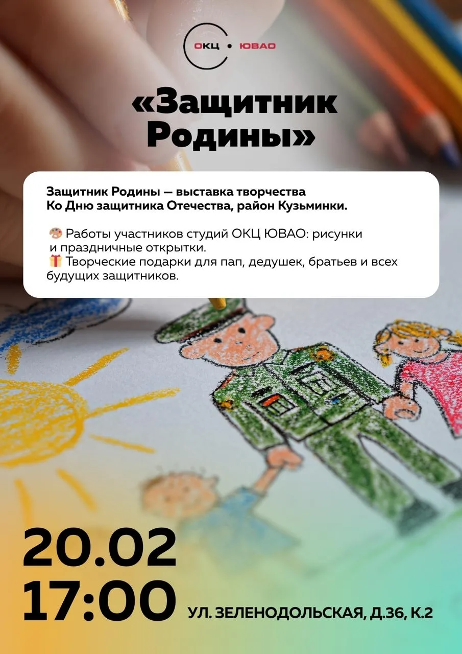 В преддверии Дня защитника Отечества в районе откроется выставка изобразительного и декоративно-прикладного искусства «Защитник Родины». Свои работы представят участники творческих студий ОКЦ ЮВАО.