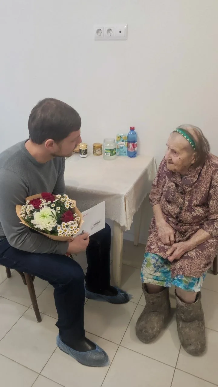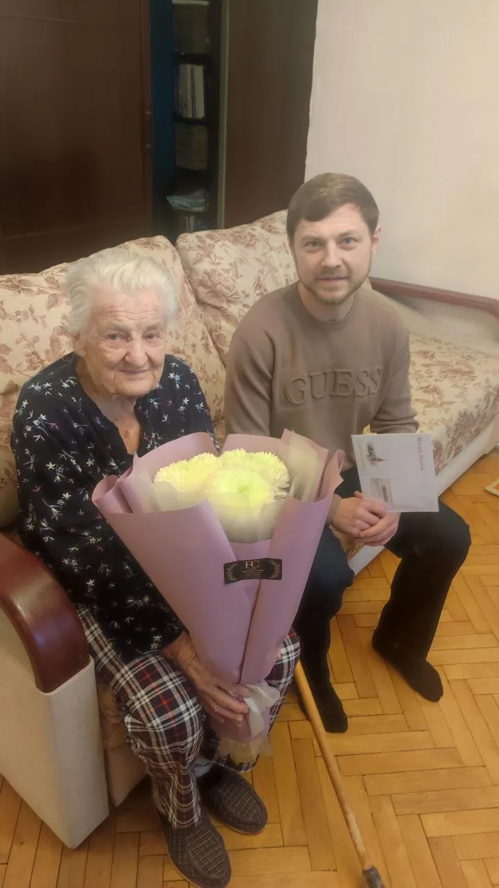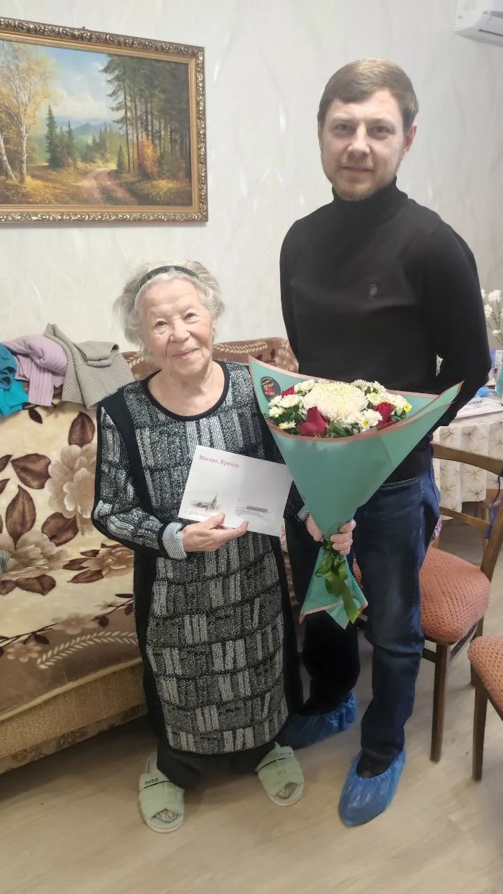 Вместе с представителями Совета ветеранов и специалистами социальной защиты заместитель главы управы по работе с населением Иван Сергеевич Грибцов лично посетил юбиляров, чтобы вручить им персональные поздравления, цветы и подарки прямо на дому.
