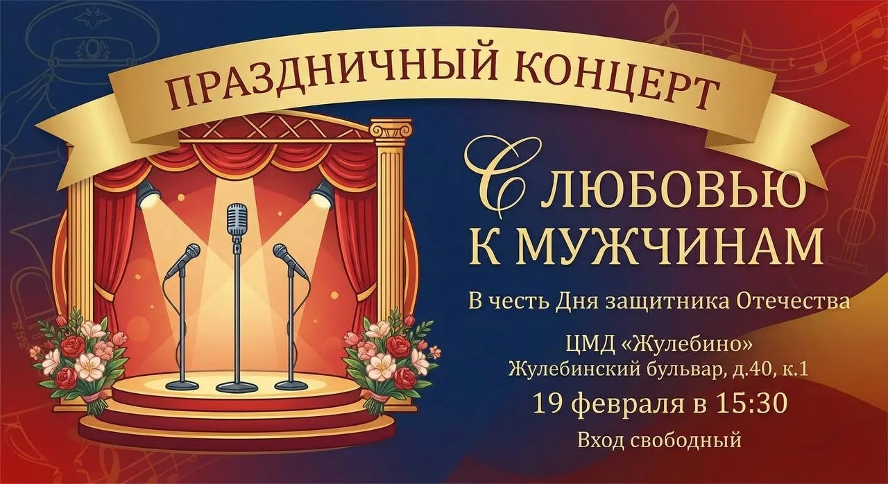 В преддверии Дня защитника Отечества ЦМД «Жулебино» приглашает на концерт с тёплым названием «С любовью к мужчинам». В программе — любимые песни и душевные мелодии в исполнении лауреатов окружных и городских вокальных конкурсов: