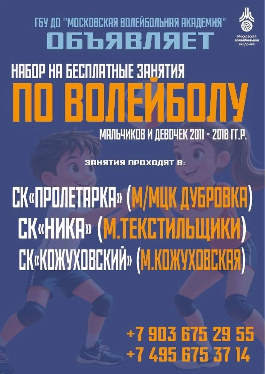 Осуществляется набор на бесплатные занятия по волейболу! Приглашаются мальчики и девочки 2018, 2017, 2016, 2015, 2014 годов рождения. Набор осуществляется в ГБУ ДО "Московская волейбольная академия", (https://t.me/moscow_volley_academy) где более 2500 спортсменов Москвы уже занимаются в современных спортивных комплексах🇦🇮
