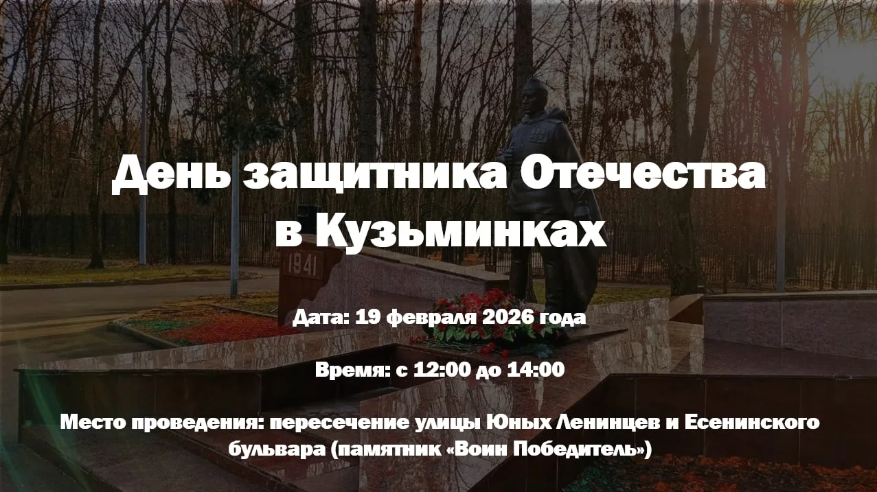 Торжественное мероприятие, посвященное Дню защитника Отечества и Дню памяти о россиянах, исполнявших служебный долг за пределами страны, состоится в районе Кузьминки 19 февраля.