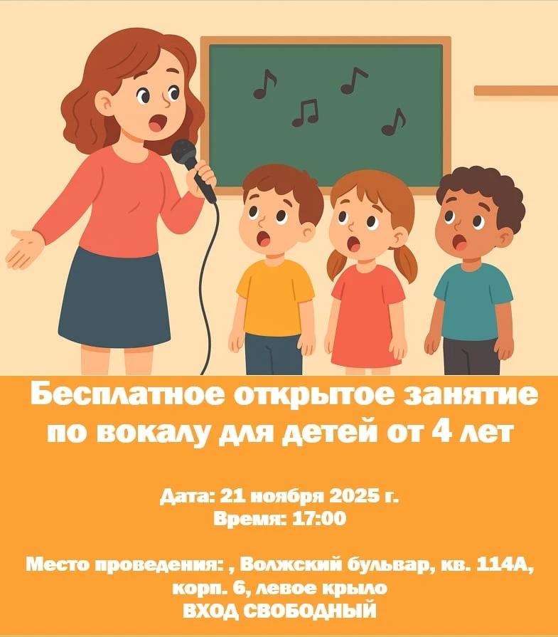 Педагоги центра «БАРС» проведут занятие по вокалу, на котором дети освоят основы правильного дыхания, поработают над дикцией и чистотой интонации. Участники разучат детские песни, выполнят упражнения на развитие музыкального слуха и ритма. Мероприятие направлено на раскрытие творческих способностей детей, развитие музыкального слуха и формирование первых навыков сценического мастерства.
