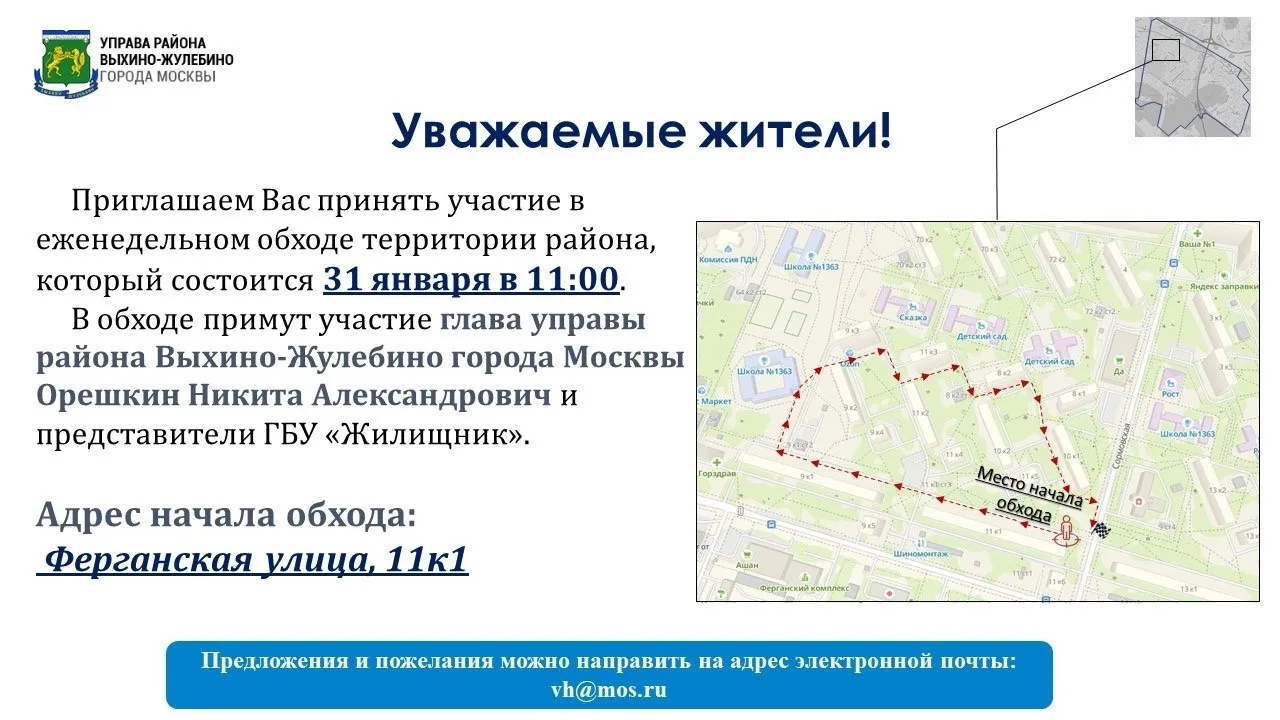 Сегодня, 24.01.2026 в 11:00, состоялся очередной еженедельный обход территории района Выхино-Жулебино.