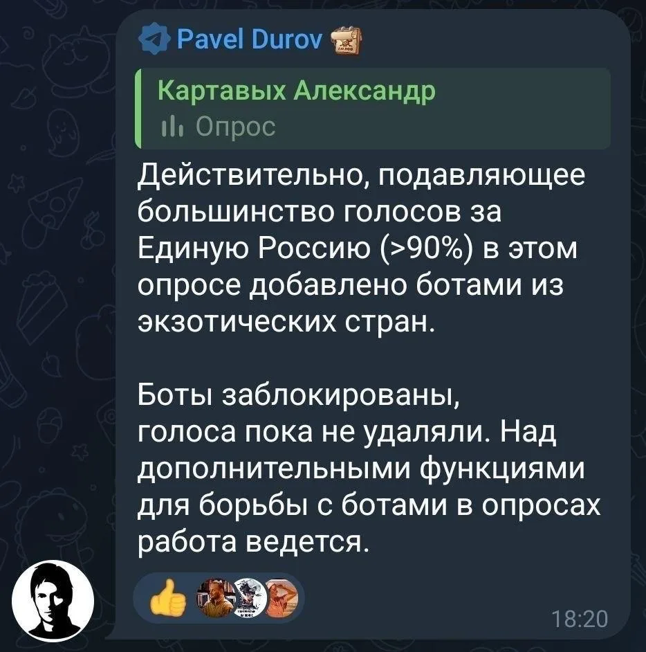 Он добавил, что Telegram работает над тем, чтобы боты не могли голосовать в опросах.