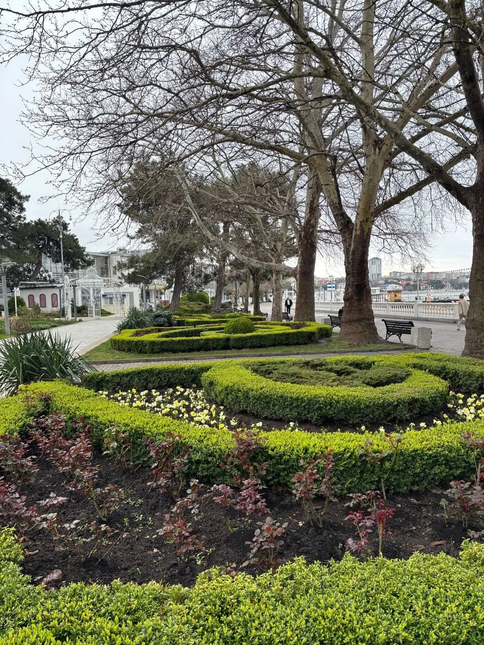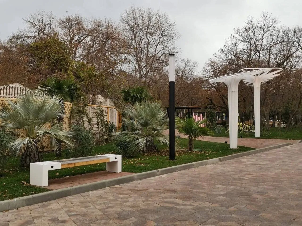 При строительстве тротуаров и дорожек сохранили все здоровые зеленые насаждения, а курортный ландшафт дополнили высаженные пальмы и олеандры.