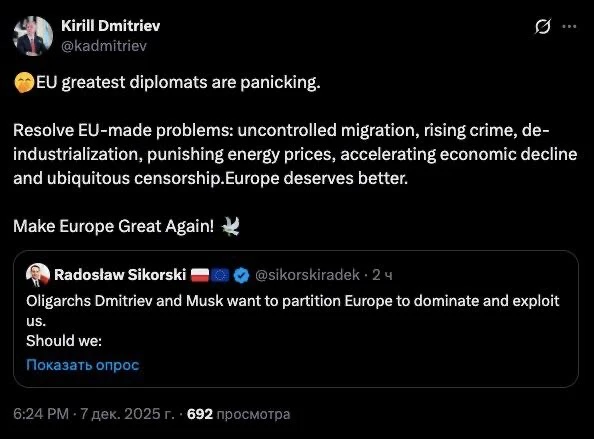 «Олигархи Дмитриев и Маск хотят разделить Европу, чтобы доминировать над нами и эксплуатировать нас.
