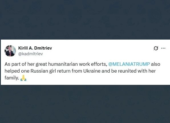 Кирилл Дмитриев сообщил, что первая леди США Мелания Трамп содействовала возвращению российской девочки из Украины.