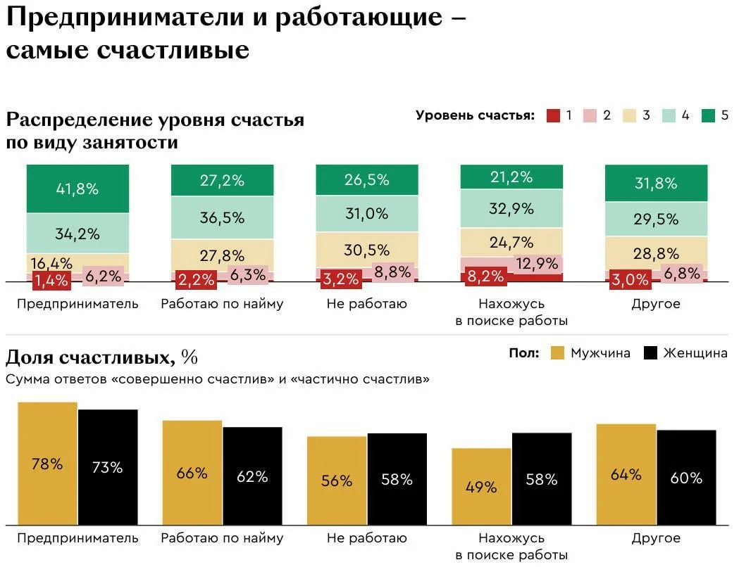 Исследования показывают, что именно предприниматели сегодня чувствуют себя наиболее счастливыми и уверенными в будущем. Трое из четырёх владельцев собственного бизнеса отмечают высокий уровень удовлетворённости жизнью. Для сравнения — в начале 90-х счастливыми себя называли лишь 6% россиян, сегодня уже 63%.
