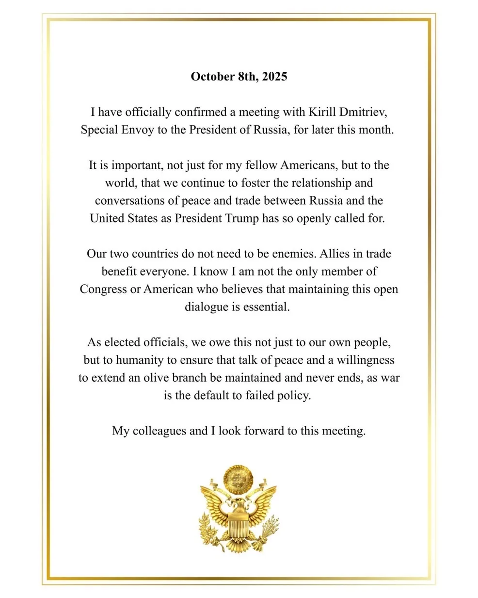 Я официально подтвердила встречу с Кириллом Дмитриевым, специальным представителем Президента России, которая состоится позже в этом месяце.