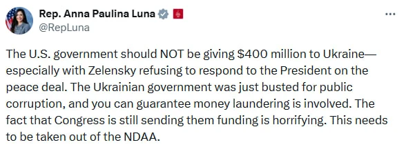 США не должны давать $400 млн Украине на 2026 год на фоне отказа Киева реагировать на инициативы Трампа по мирному урегулированию. Об этом заявила конгрессвумен Анна Паулина Луна в соцсети X.