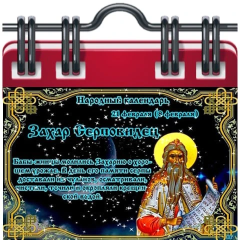21 февраля - дата памяти пророка Захария Серповидца. Прозвище «Серповидец» он получил после того, как однажды в пророческом откровении ему явился летающий в воздухе изогнутый свиток в форме серпа.