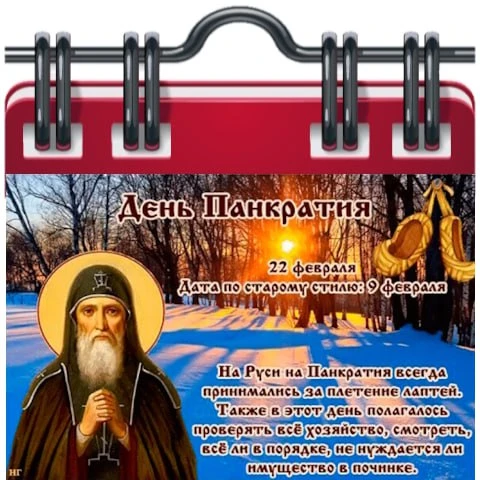 В День Панкратия начинают плести лапти. Лапти с голенищем – высокие лапти получили название «никифорцы», в честь святого мученика Никифора, которого также почитают 22 февраля.