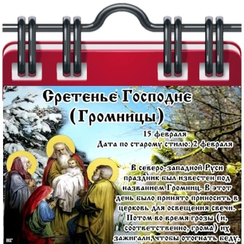 15 февраля вспоминают встречу в Иерусалимском храме Симеона Богоприимца с маленьким Иисусом при совершении обряда посвящения Богу. Народное название праздника – Громницы.
