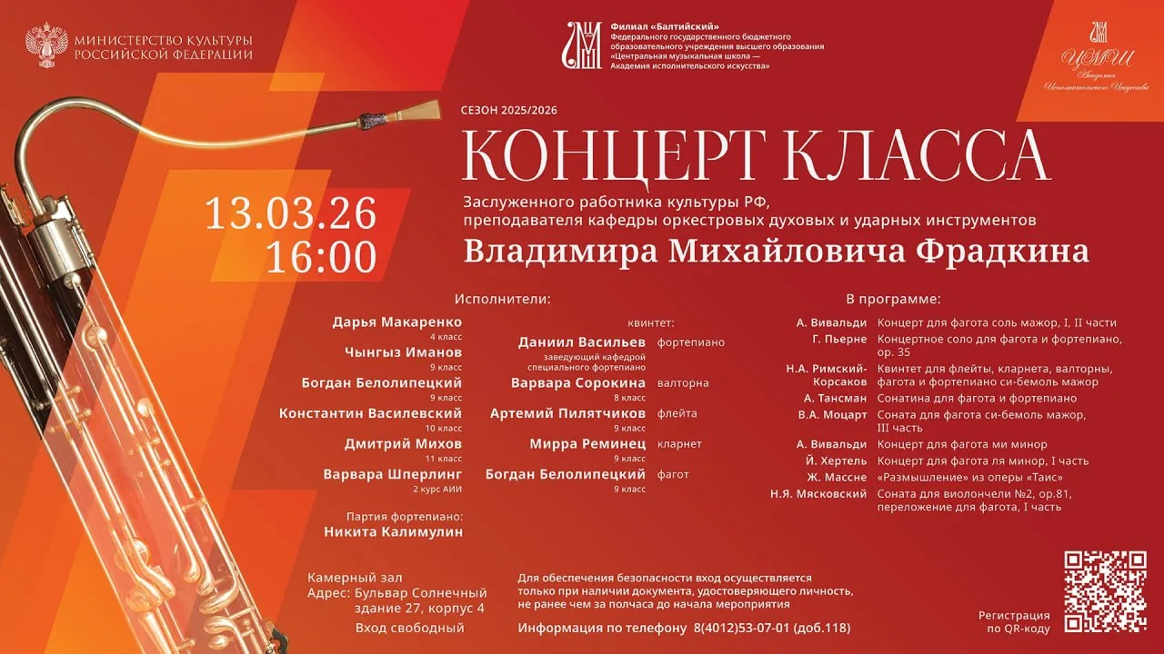 Гостей приглашают на концерт класса преподавателя кафедры оркестровых духовых и ударных инструментов Фрадкина Владимира Михайловича.