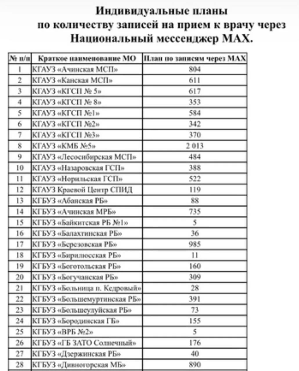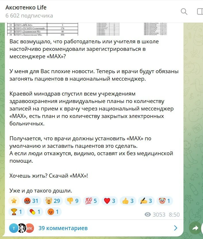 Тем временем, как сообщает политконсультант Алексей Аксютенко, Минздрав Красноярского края направил больницам «индивидуальные планы» по записи жителей на приём через мессенджер MAX.