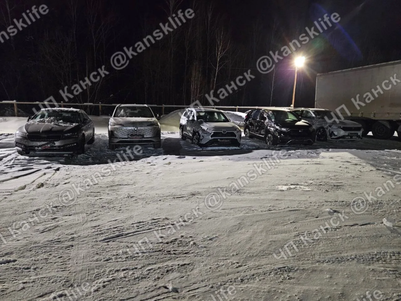 Фото автомобилей, которые находились на автовозе, опрокинувшемся недалеко от Канска.