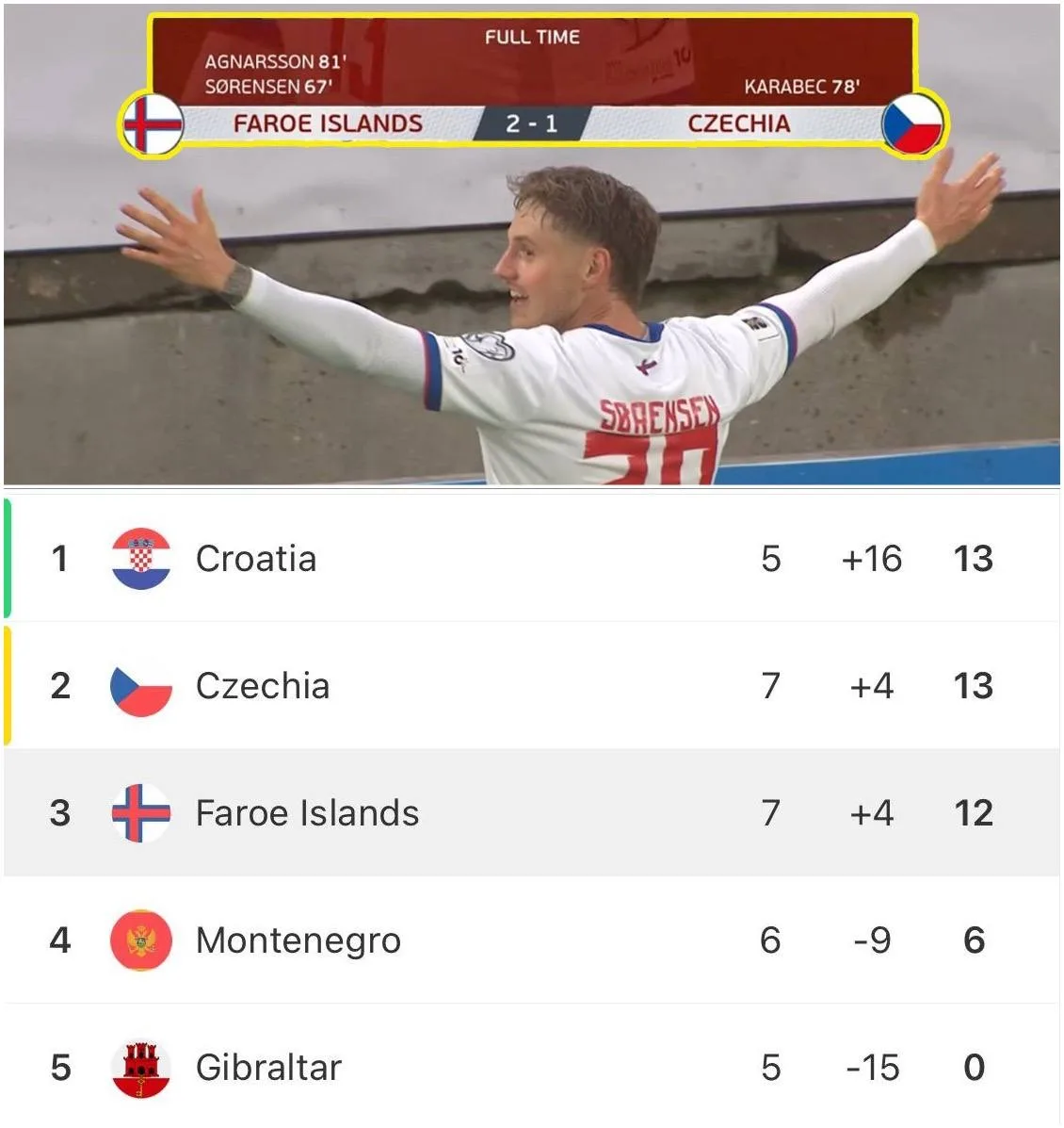 55-тысячные Фареры обыграли подряд Черногорию и Чехию в отборе на ЧМ: команда Эйдуна Клакстейна совершила вторую сенсацию подряд и проводит свой лучший в истории квалификационный турнир на первенство планеты. Шансы поехать в США, Мексику и Канаду все еще чисто теоретические — Фареры отстают от 2-го места, которое дает право на стыки, на 1 очко, но впереди матч с хорватами, а у чехов — с Гибралтаром. Несмотря на это, небольшая островная страна с население 55 тысячи человек может быть довольна собой — у команды 4 победы в 5 последних официальных матчах.