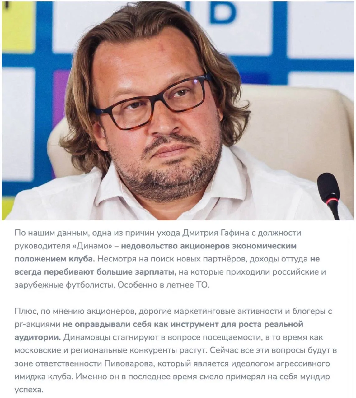 Гафин ушел из Динамо точно не из-за экономического положения клуба: Дмитрий не имел прямого отношения к коммерции, подписанию новых партнеров, маркетингу, посещаемости и PR.