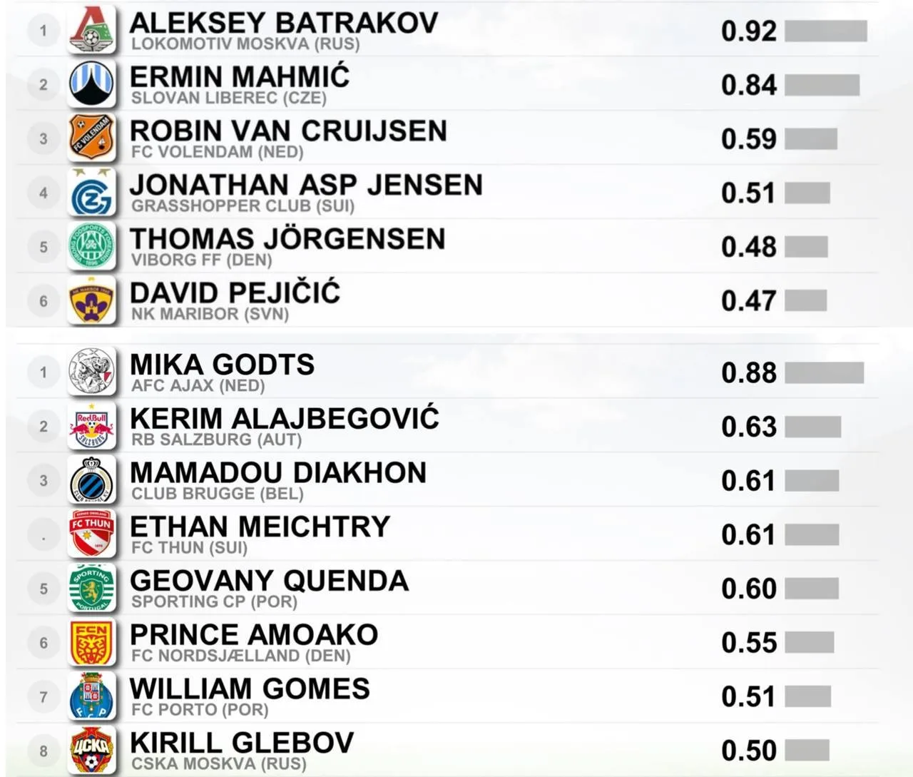 В рейтинге лучших молодых вингеров старого света — Глебов из ЦСКА, у которого в среднем 0,5 голевых действий. Армеец занял в рейтинге от CIES 8 место. Лидер — Гедтс из Аякса.