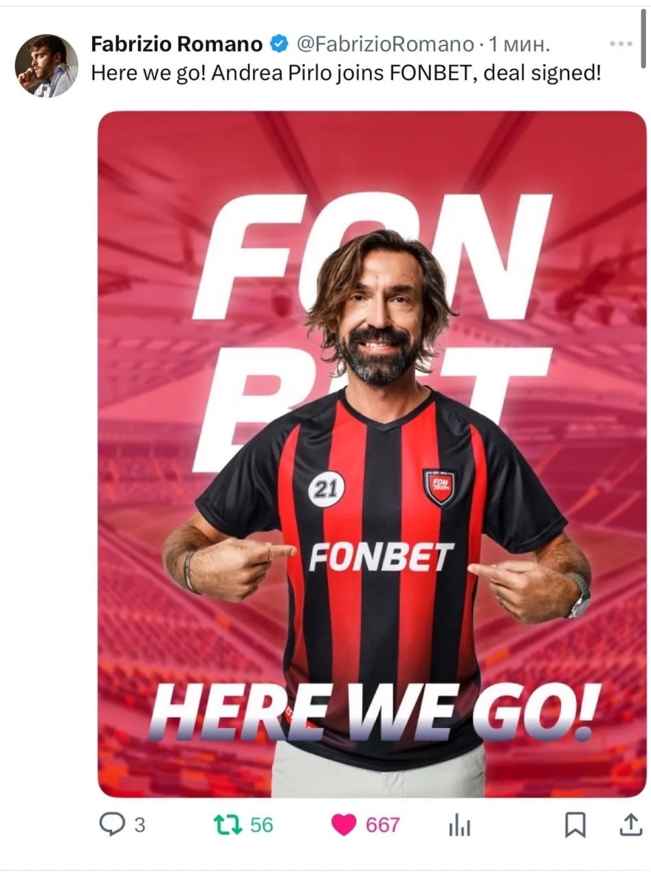 Сегодня Пирло стал представителем Fonbet. Не знаю, как в этот раз Андре объявил друзьям о своем «трансфере» в Россию, но букмекер представил его стильным роликом.