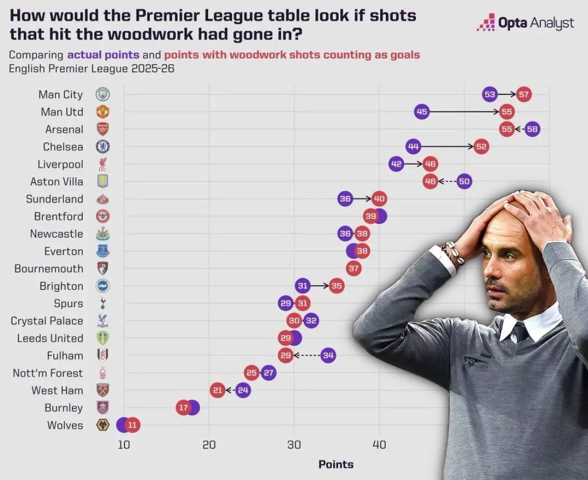 Opta Sports подсчитала, сколько очков набрали бы клубы АПЛ, если бы все удары в каркас закончились взятием ворот.