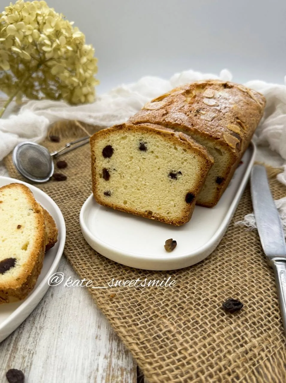 7. В тесто вводим просушенный изюм, перемешиваем и выкладываем в форму 10*20 см. Форму предварительно нужно смазать растительным маслом, просыпать мукой и, по желанию, простелить пергаментом. Сверху кекс можно присыпать миндальными лепестками;