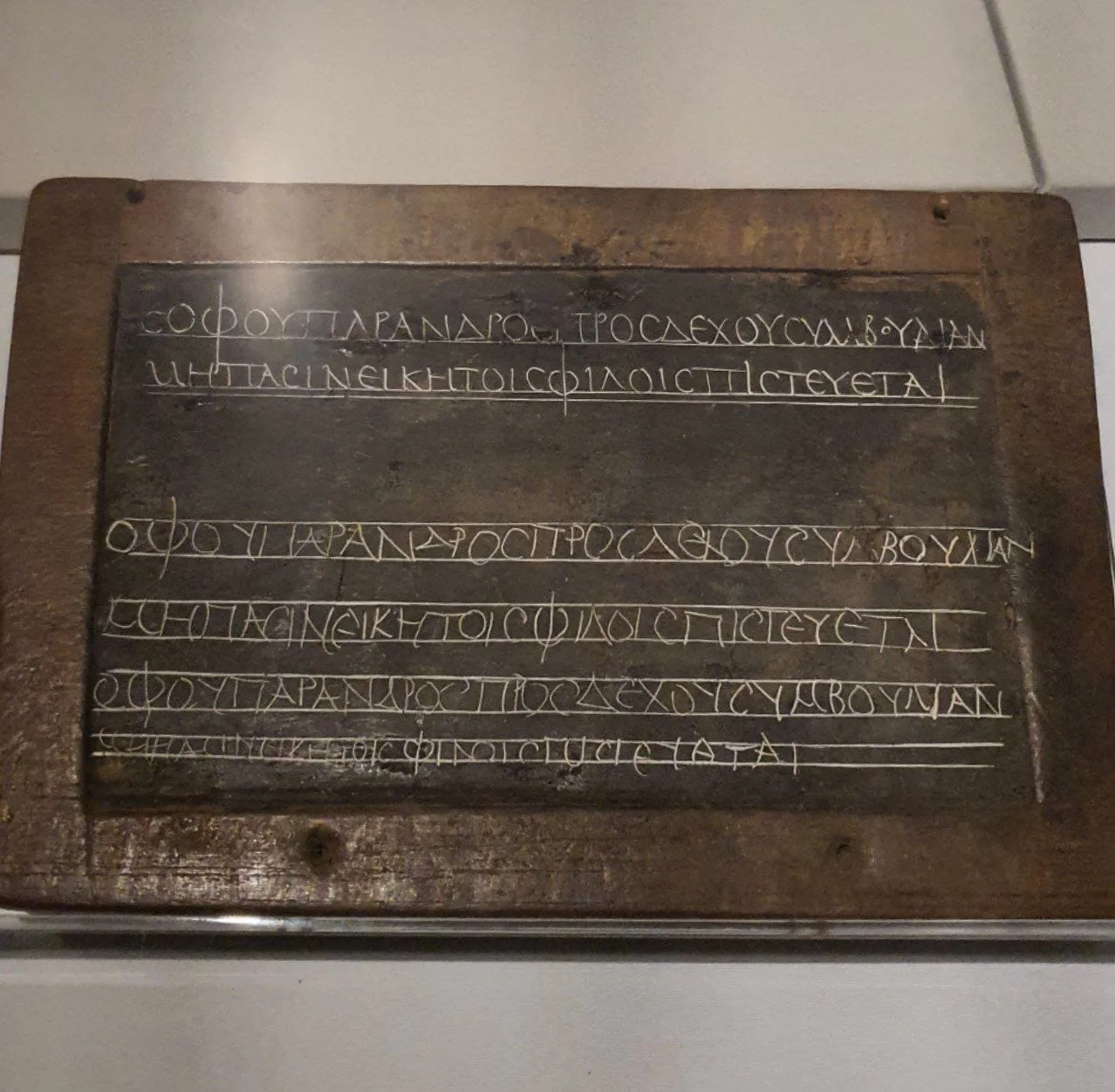 Настало время вернуться не только на работу, но и в школу. В Британской библиотеке хранится восковая "тетрадь для домашних работ" ученика начальной школы двухтысячелетней давности. Сверху таблички выведены две строки на греческом, которые ученик должен был дважды прописать ниже.