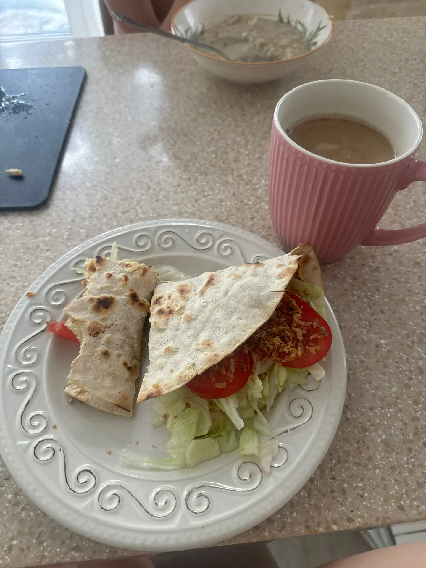 Намазала на 1 сторону лепешки. Обжарила с двух сторон. Сняла, внутрь айсберг, помидор и лук фри.