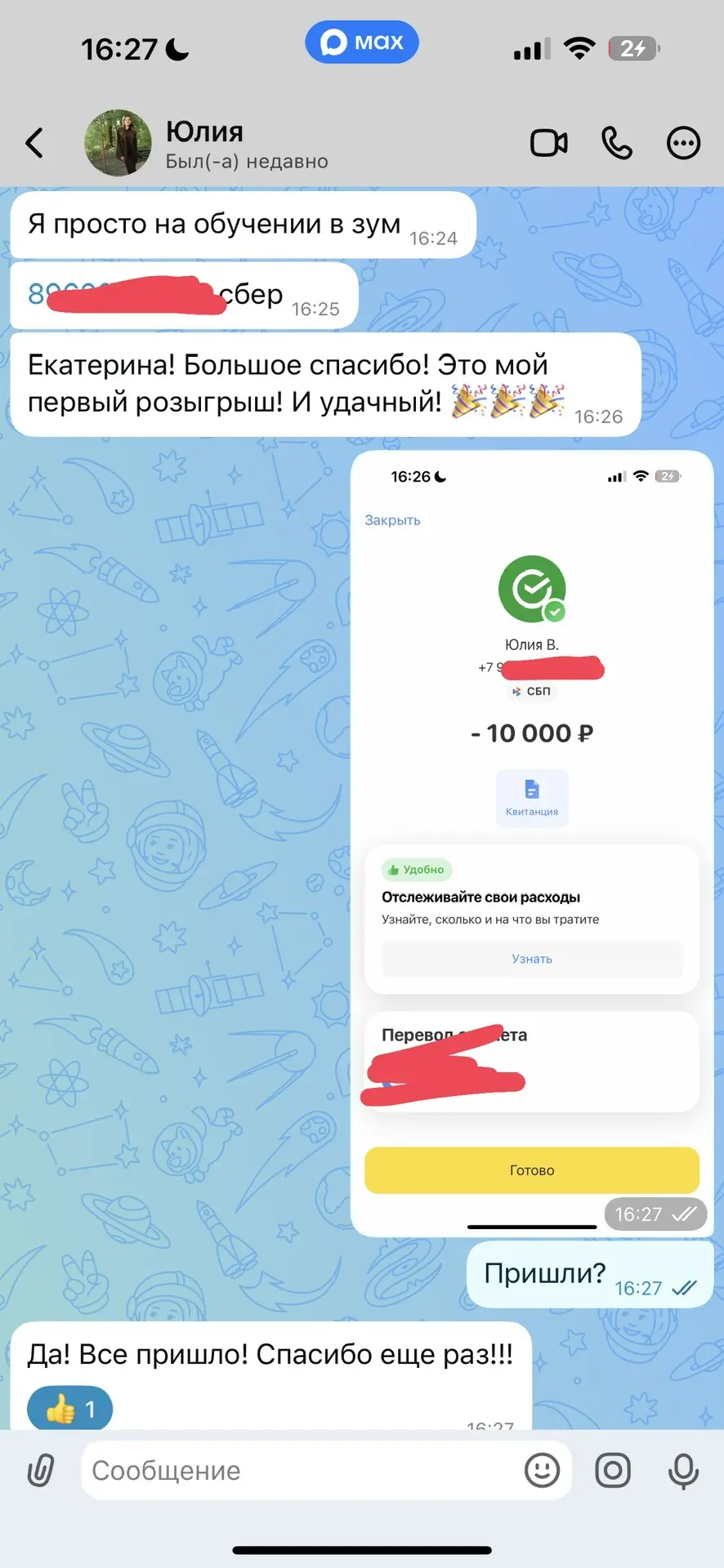 Сейчас была моя очередь выбирать счастливчика и 10 000 ₽ уже оперативно переведены 🎉