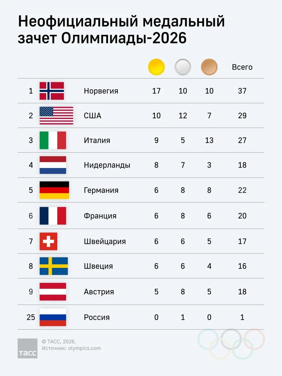 🏅 Итоги после 15 медальных дней на Олимпийских играх в Италии. 21 февраля было разыграно девять комплектов наград.