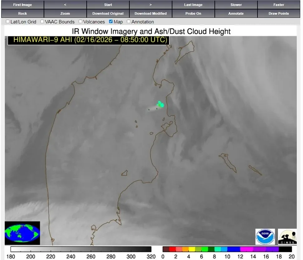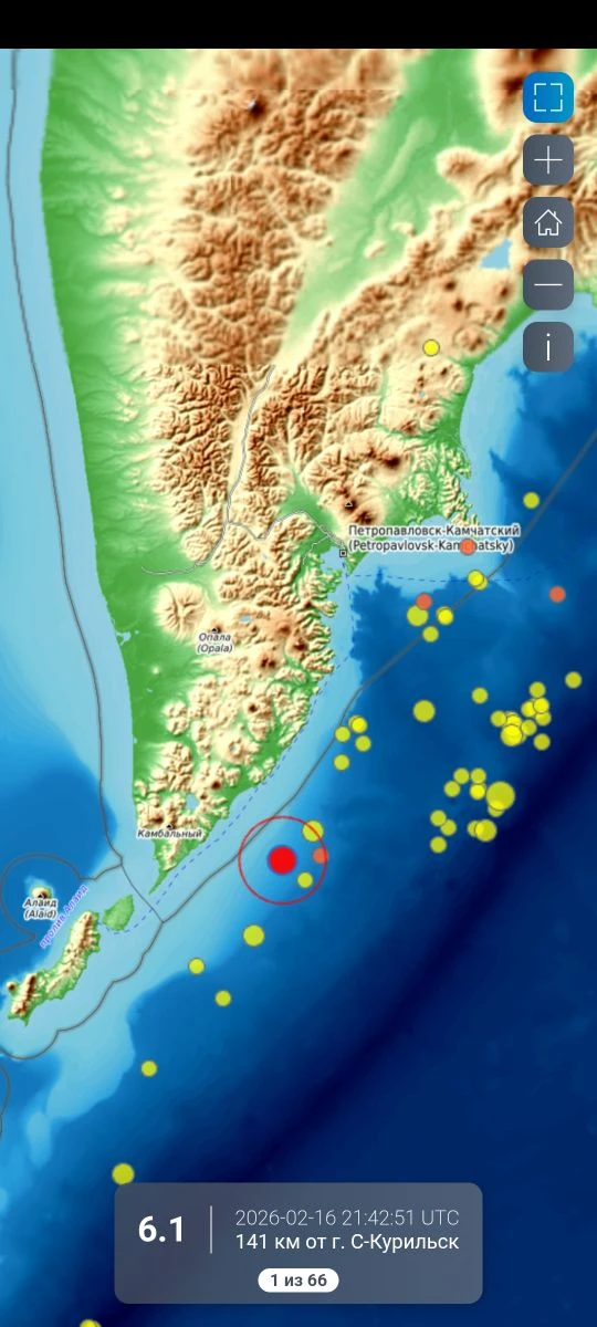 16 февраля 2026 г. в 21:42 UTC на юге Камчатки произошло землетрясение с ML = 6.3 (MW = 6.0), ощущавшееся на мысе Лопатка интенсивностью 5 баллов, на маяке Курбатова и в г. Северо-Курильске – 4–5 баллов, в гг. Петропавловск-Камчатский, Вилючинск, Елизово – 3–4 балла.