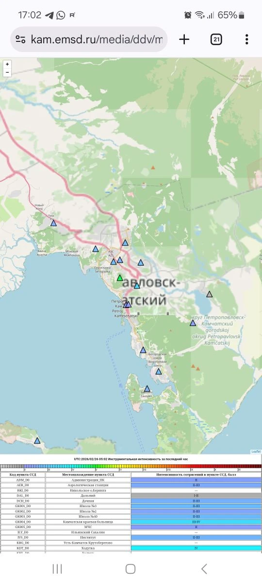 Уровень сейсмичности Камчатского участка зоны субдукции (по состоянию на 26 февраля 2026 г.) – фоновый повышенный по шкале СОУС'09. (http://emsd.ru/files/ku/ViS2011-SOUS.pdf).