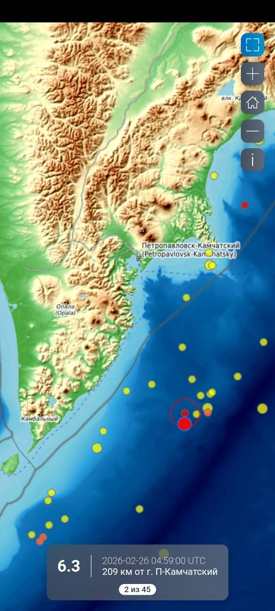 26 февраля 2026 г. в 04:59 UTC на юге Камчатки произошло землетрясение с ML = 6.3 (MW = 5.6), ощущавшееся в гг. Петропавловск-Камчатский, Вилючинск, Елизово интенсивностью – 3 балла.