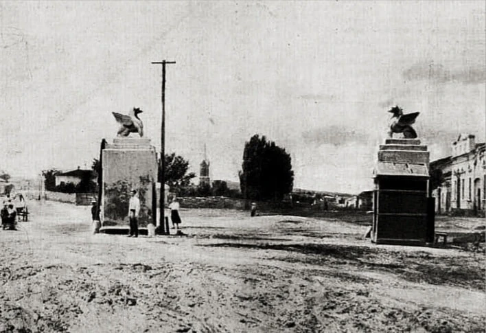 Грифоны сторожат въезд в Керчь, а между ними виднеется шпиль немецкой кирхи.