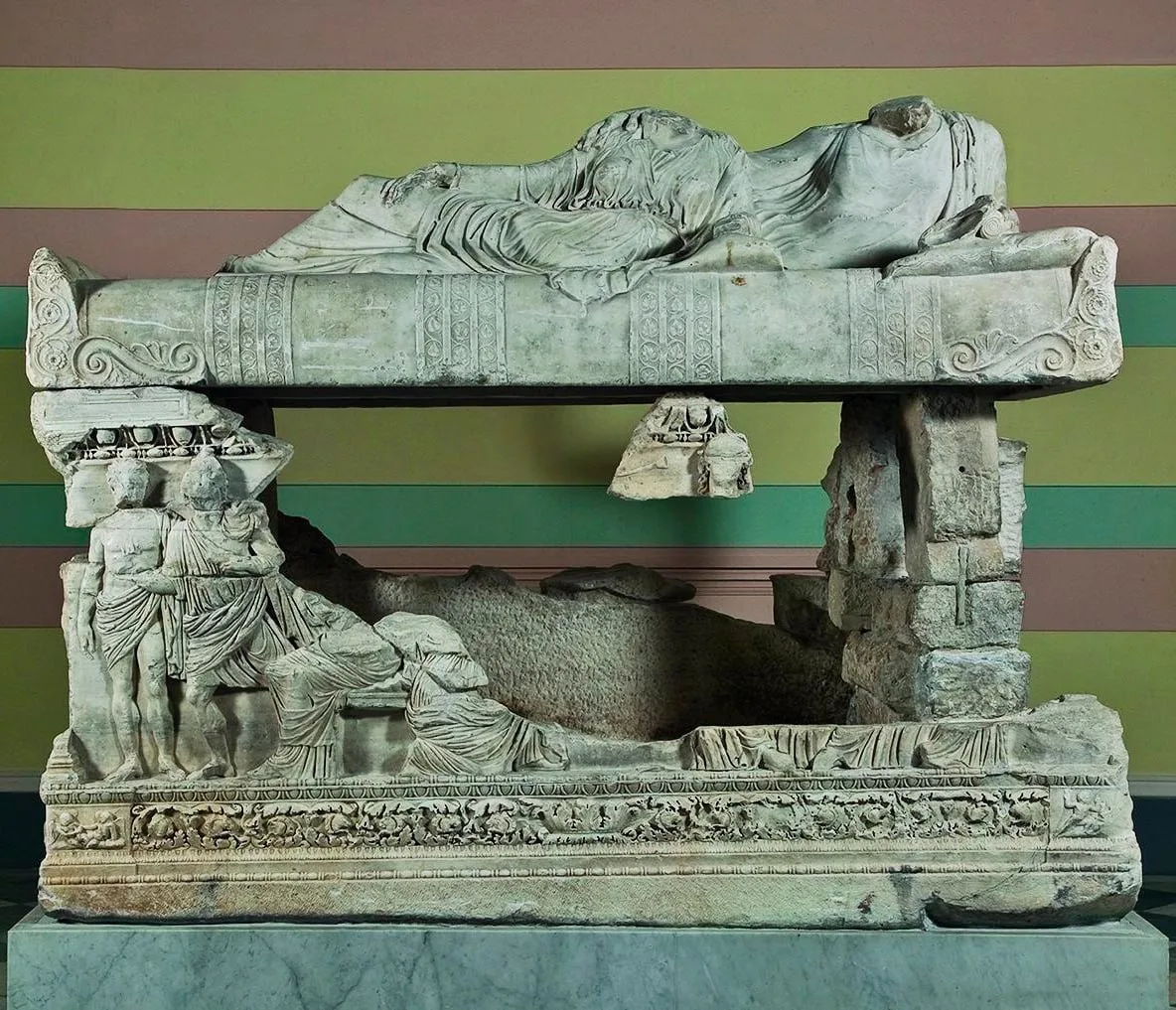Считается, что саркофаг был изготовлен в Аттике во втором веке нашей эры и мог использоваться при погребении члена правящей в Боспорском царстве (куда в то время входил Мирмекий) династии Тибериев Юлиев.