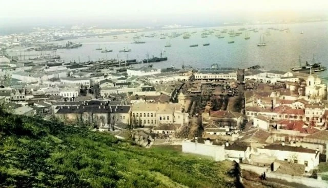 Больше полусотни судов в Керченской бухте. Это вид с горы Митридат на центр дореволюционного города.