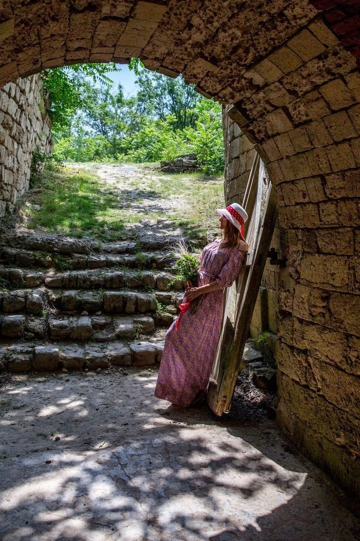 Фотография Алисы Колпаковой у входа в главный пороховой погреб Керченской крепости.