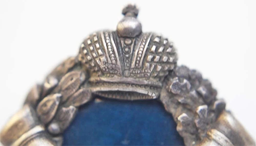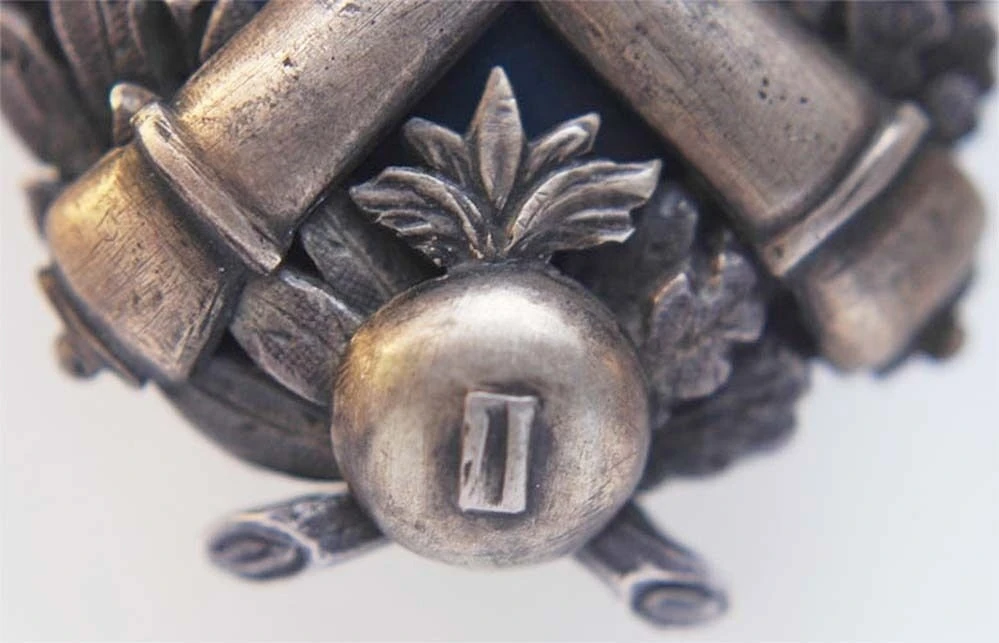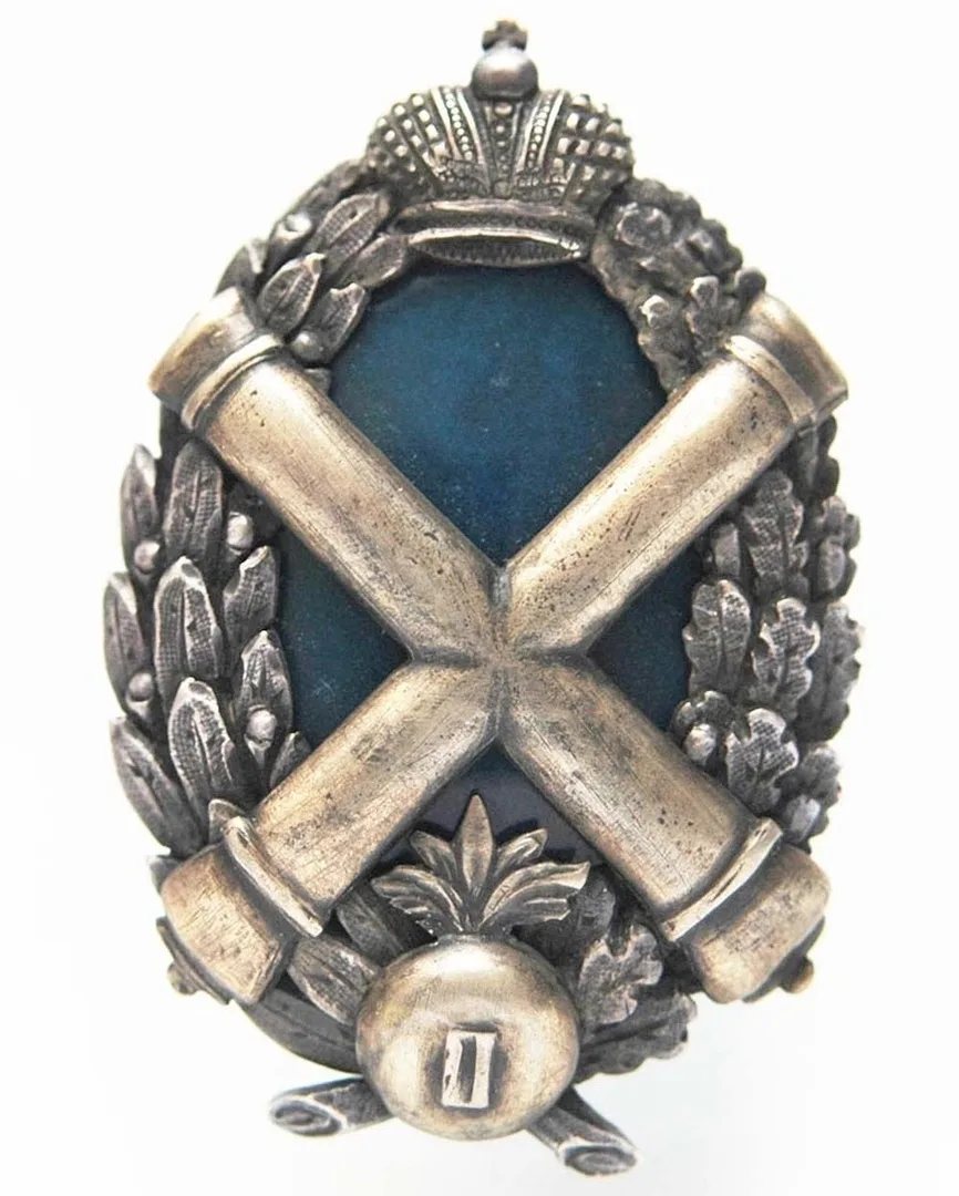 Только офицеры-артиллеристы Керченской крепости носили такие значки с перекрещёнными пушками и императорской короной поверх голубой эмали.