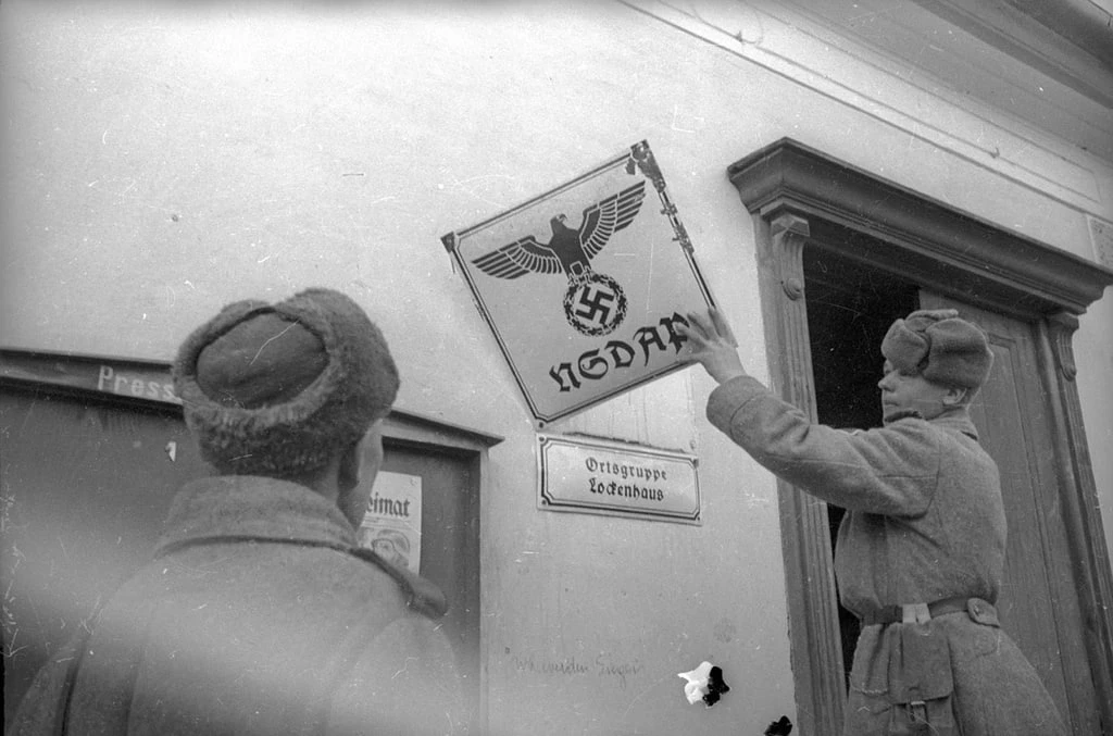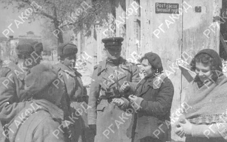 На здании видна табличка на немецком языке, а с военным общаются жители города — Фрикова Нина Лаврентьевна и ее дочь Лидия.