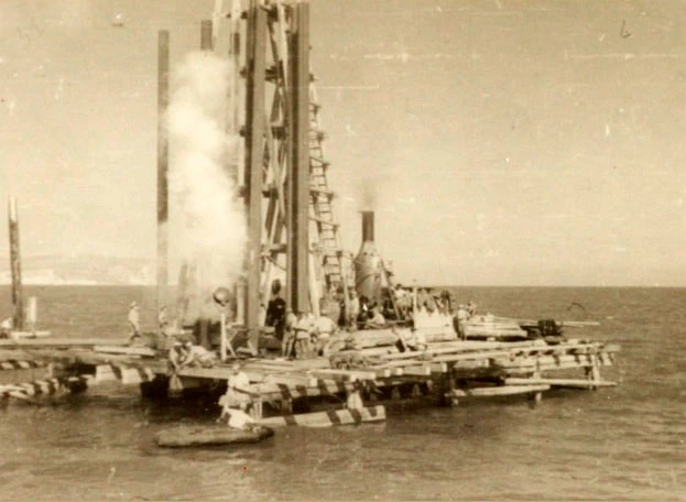 1944 год. В илистое дно забивают сваи под опору разводного пролёта первого моста через Керченский пролив.
